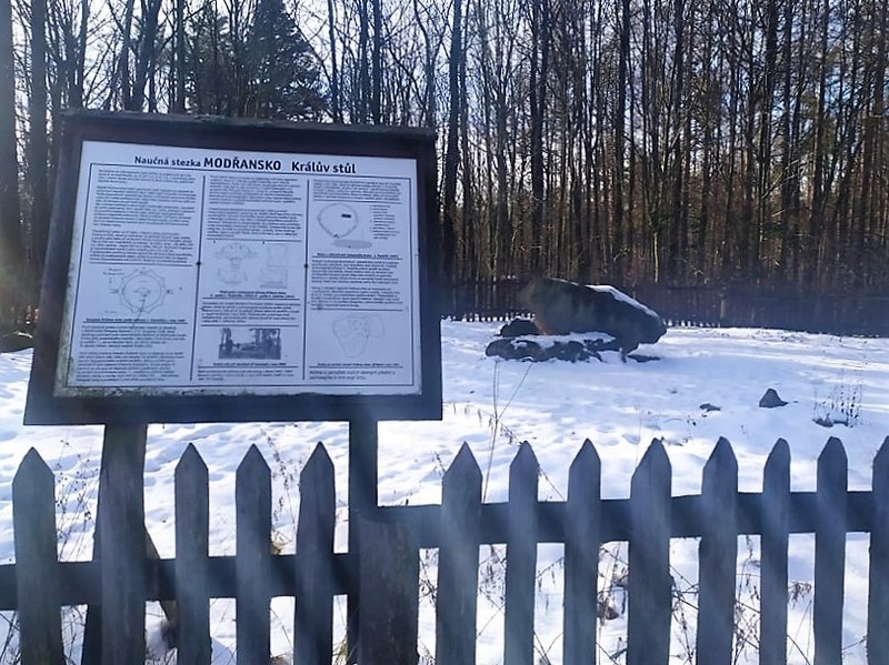 Výchozím místem výletu bude Archeoskanzen Modrá nedaleko Velehradu, rozcestník turistických tras je u rybníka v blízkosti skanzenu. Po modré turistické značce jdeme nejprve kolem repliky staroslovanského kostela sv. Jana Křtitele. Stojí nedaleko původních základů z 9. století, rozhodně do této prosté stavby nahlédněte. Po cca 1,5 km chůze po zpevněné cestě shlédneme okolní krajinu z rozhledny Modrá. Od rozhledny procházíme mezi vinohrady, polními a lesními cestami ke Královu stolu. Také budeme míjet soustavu lesních rybníků vybudovaných na Modranském potoce. Část cesty nám bude dělat společnost Naučná stezka Fauna a flóra Chřibů.¨
