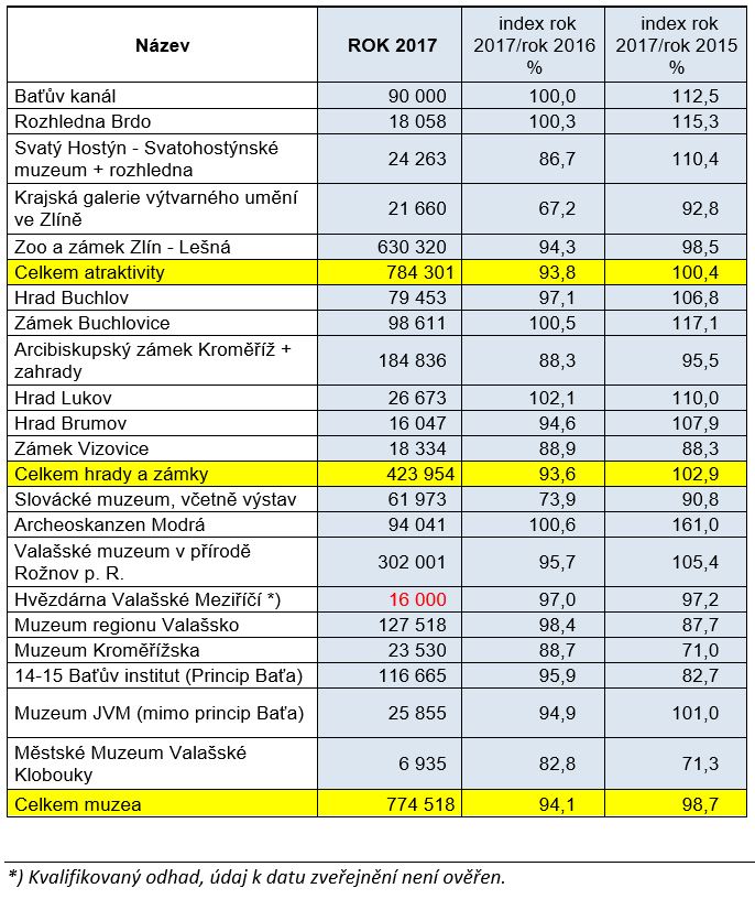 Návštěvnost referenčních cílů v r. 2017 je druhá nejvyšší v časové řadě sledované od r. 2008. Dosud nejvyšší návštěvnost byla zaznamenána v roce 2016, kdy významné cíle (Zoo a zámek Zlín-Lešná, Valašské muzeum v přírodě či Archeoskanzen Modrá) vykázaly skokově rekordní návštěvnost. Třetí nejúspěšnější sezona z pohledu referenčních cílů byla zaznamenána v roce 2015.