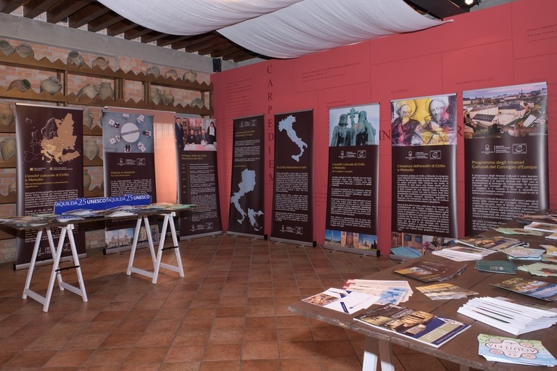 Výstava představující kulturní stezku spojenou se slovanským kulturním dědictvím je k vidění v biskupském paláci naproti baziliky. Termín ukončení výstavy zatím není stanoven, ještě v zimních měsících by se však měla přesunout do Říma. Otevření interiérové výstavy, sestávající ze dvanácti rolovacích panelů, předcházela prezentace Cyrilometodějské stezky na mezinárodní konferenci kulturních a poutních stezek, které procházejí tímto památným místem. „Přes Aquileiu putovali v raném středověku i sv. Cyril s Metodějem, proto se jedná o významné místo Cyrilometodějské stezky v Itálii. Vede tudy trasa směrem na Řím, kde je sv. Cyril pochován. S představiteli města jsme jednali například o spolupráci v cestovním ruchu – v příštím roce sem budou směřovat cesty českých cyklopoutníků i slovenských motopoutníků,“ řekla Dana Daňová, předsedkyně Řídicího výboru sdružení Evropská kulturní stezka sv. Cyrila a Metoděje.